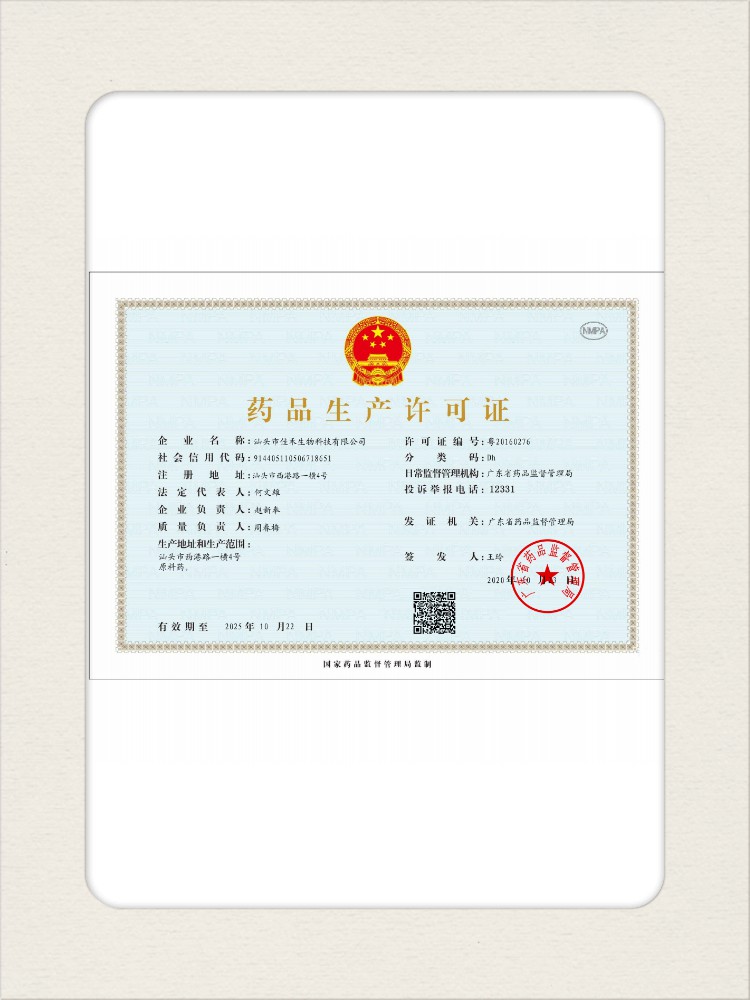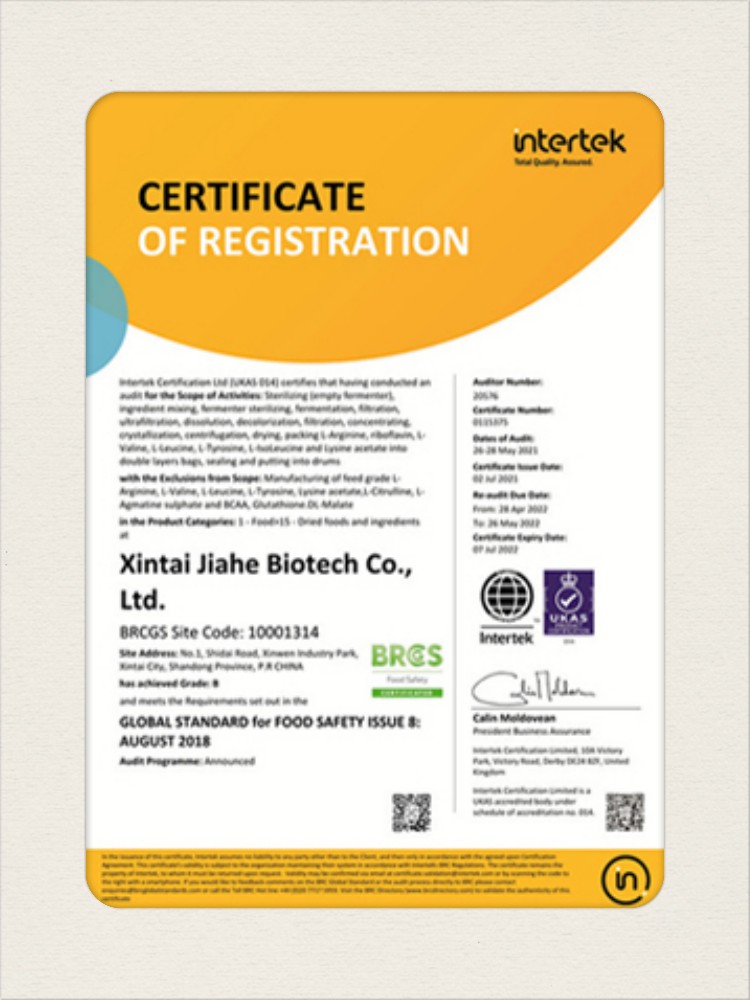 汕頭佳禾生物科技有限公司是一家致力于氨基酸及其衍生物研發(fā)、生產和銷售的國家高新技術企業(yè),先后通過了國家藥品GMP認證,ISO9001質量體系認證、ISO14001環(huán)境管理體系認證。目前,公司擁有“廣東省專精特新中小企業(yè)”、“廣東省氨基酸產品工程技術研究中心”、“汕頭市生物發(fā)酵工程技術研究開發(fā)中心”、“汕頭市知識產權優(yōu)勢企業(yè)”、“多項國家發(fā)明專利”、“廣東省守合同重信用企業(yè)”等多項資質和榮譽,旗下“佳禾牌”系列產品已成為原料藥行業(yè)知名品牌。 新泰市佳禾生物科技有限公司成立于2012年8月,注冊資金2億元,公司位于山東泰安新泰市新汶工業(yè)園區(qū),是國 家級高新技術企業(yè)、山東省“專精特新”企業(yè)、山東省制造業(yè)單項冠軍企業(yè)、泰安市科技型中小企業(yè)、泰安市農業(yè)產業(yè)化龍頭企業(yè)、中國生物發(fā)酵產業(yè)協(xié)會理事單位。